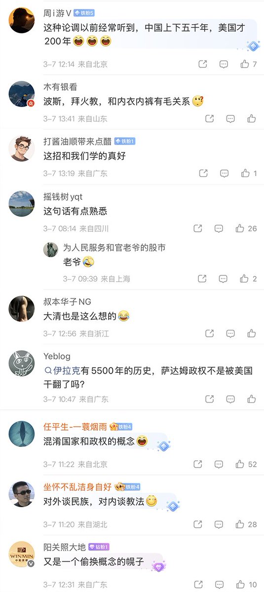 网友们调侃:“这论调似曾相识,中国上下五千年,美国才200年” “这招我们学的好” “大清也是这么想的”