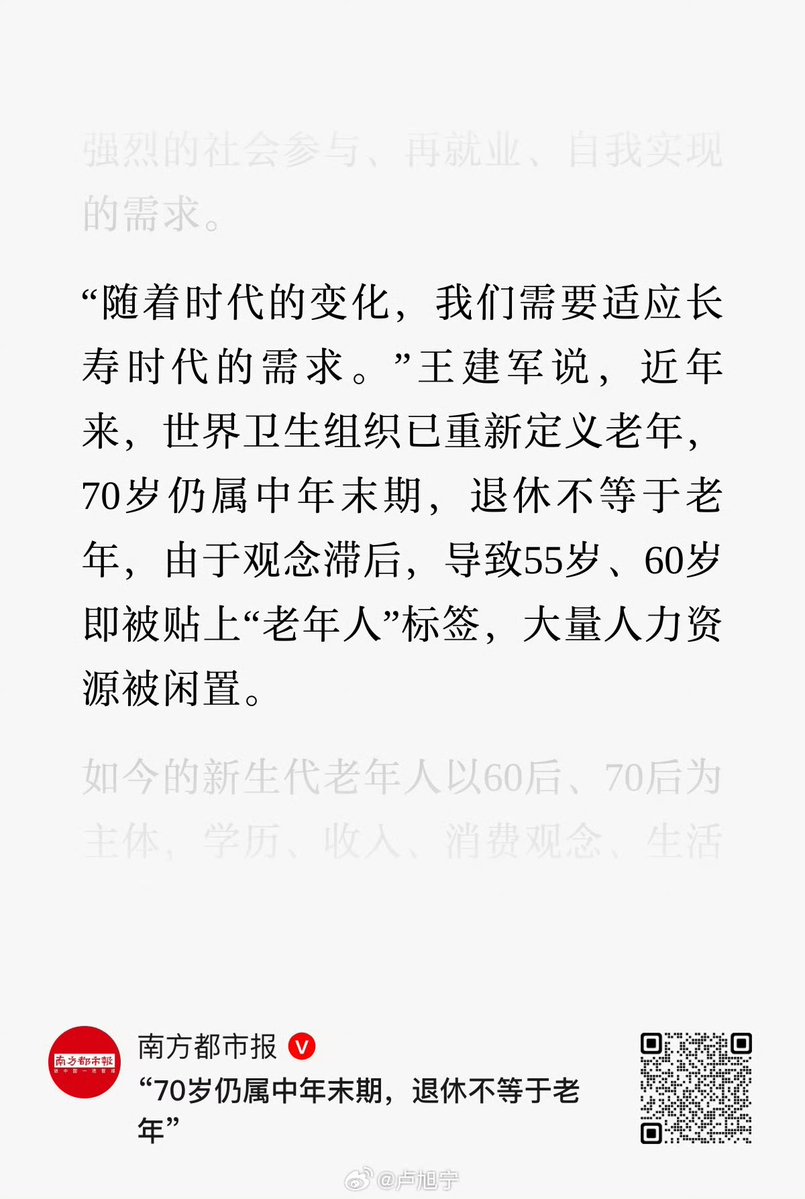 3月6日,全国政协人口资源环境委员会副主任 王建军表示:70岁仍属中年末期,退休不等于老年,由于观念滞后,导致55岁、60岁即被贴上“老年人”标签,大量人力资源被闲置。