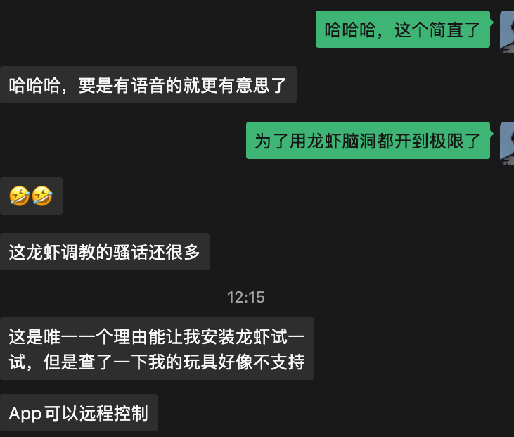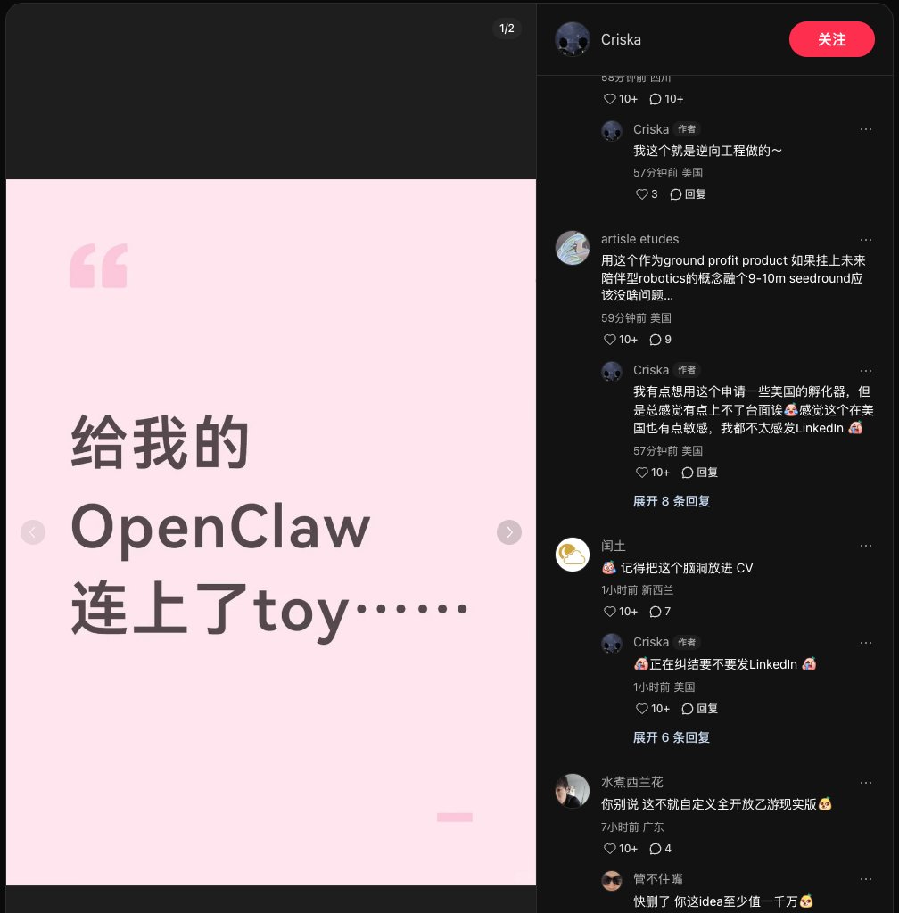 这是近期我最近看到小龙虾开发最有创意的idea 小红书上有女生把小龙虾接上了她的情趣小玩具们,调教一堆骚话,然后就可以语言和动作配合玩自己了😂😂😂 悄悄问了一下关系不错的学妹求证女生对这种应用是不是真有需求,结果好像反应还很积极? 不知道会不会有机灵的Toy厂商及时更近,这是实打实能赚钱的龙虾应用🥳