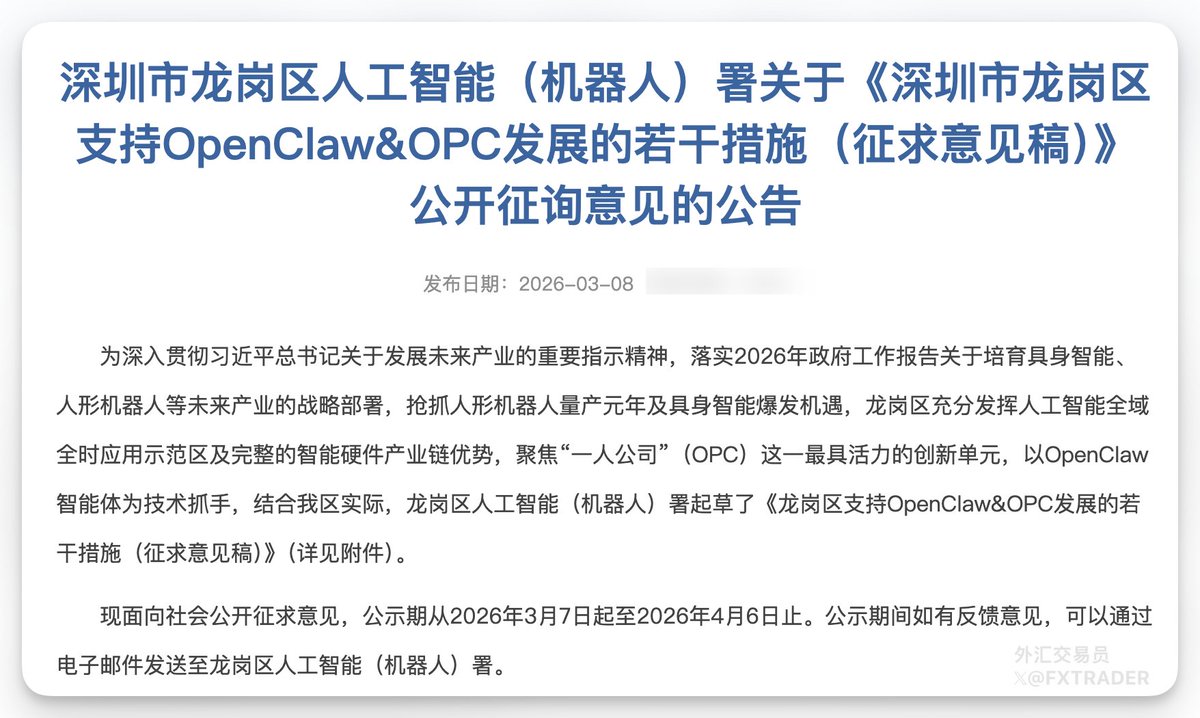 近日,深圳市龙岗区人工智能(机器人)署发布《深圳市龙岗区支持OpenClaw&OPC发展的若干措施(征求意见稿)》,提出多项扶持政策推动相关产业发展。