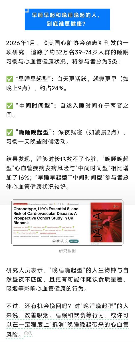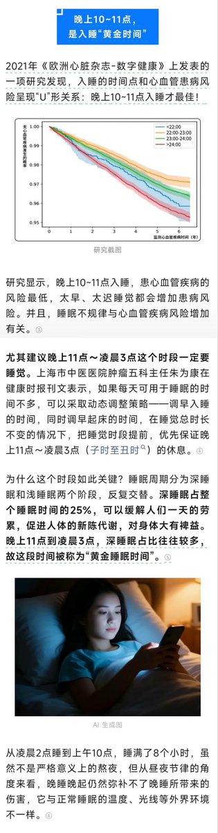 熬夜伤身,但过早入睡同样不推荐。2021 年发表于《欧洲心脏杂志·数字健康》的研究显示,入睡时间与心血管患病风险呈U形关系,晚上10~11点入睡最为理想。