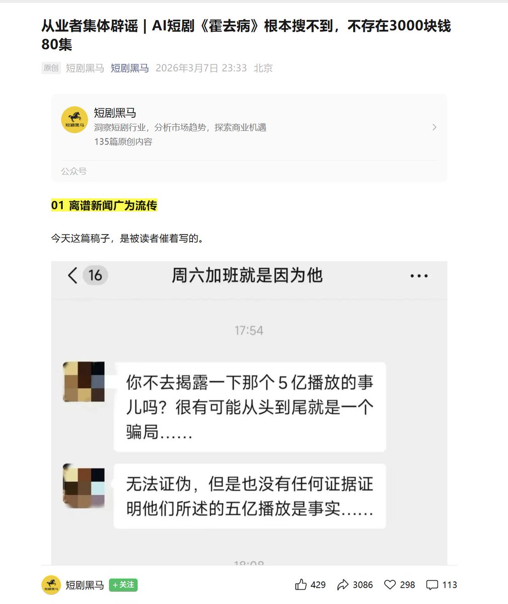 随后圈内业者集体辟谣:AI短剧《霍去病》根本搜不到,更不不存在3000块钱80集,可能是杨涵涵导演方花钱买通稿宣传旗下的纳米漫剧工具。