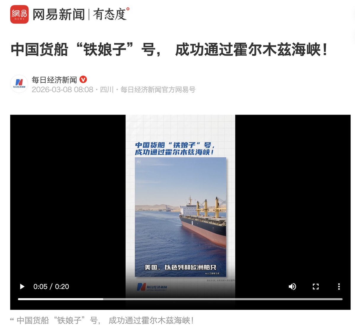 尽管有辟谣视频,但3月8日,成都传媒集团主管主办的《每日经济新闻》仍然发布新闻:中国货船“铁娘子号”,成功通过霍尔木兹海峡!