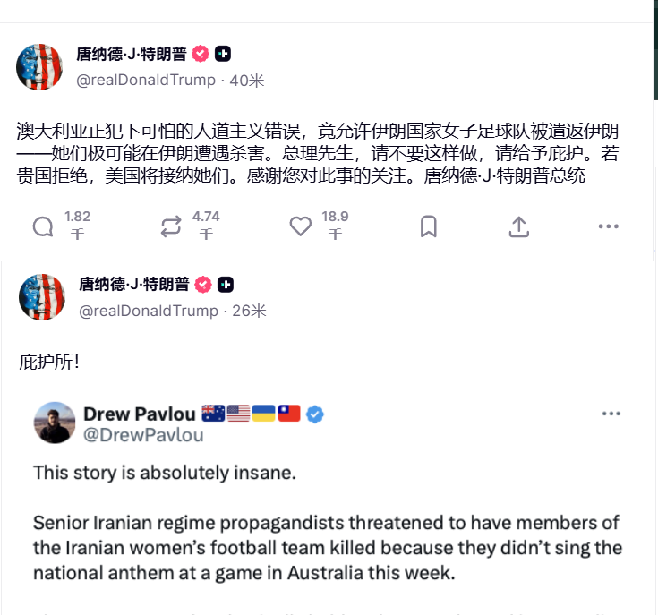 刚刚,川普连发两条推文,呼吁澳大利亚给予伊朗女子足球队全员庇护。