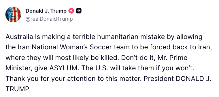 在伊朗女足拒絕演唱國歌後,川普呼籲澳洲向她們提供庇護。 “如果你們不接收她們,美國就會接收她們。”