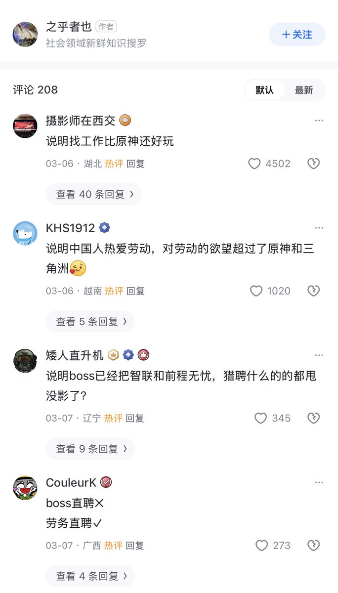 对此,另一位网友讽刺回复:“说明现在找工作,比玩《原神》还好玩。”