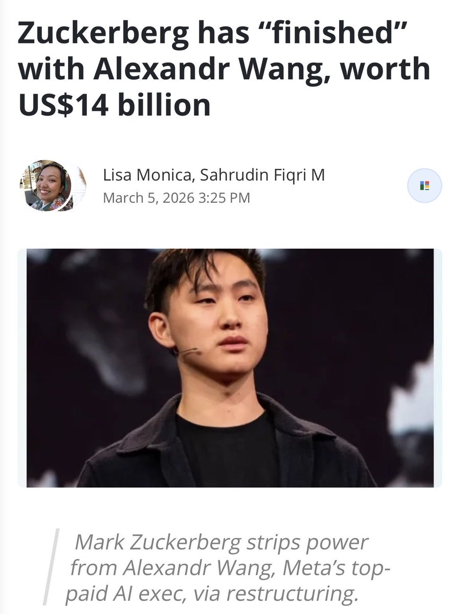 大概率还是这位空降来的天才与Meta原来的AI元老冲突严重内斗不休,小扎失去耐心了。