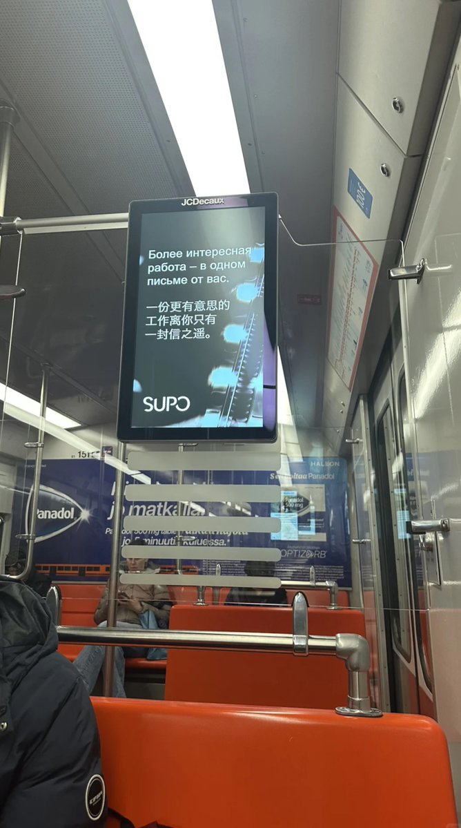 3月9日,芬兰 赫尔辛基,有小红书网友在地铁车厢内发现SUPO(芬兰安全情报局)的招聘信息,而这条信息仅仅用中文和俄语标注