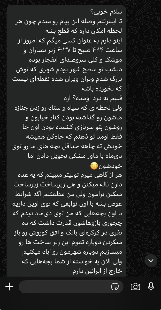 اینو دارم به عنوان کسی میگم که امروز از ساعت ۴:۱۴ صبح تا ۶:۳۷ زیر بمباران و موشک و کلی سروصدای انفجار بوده