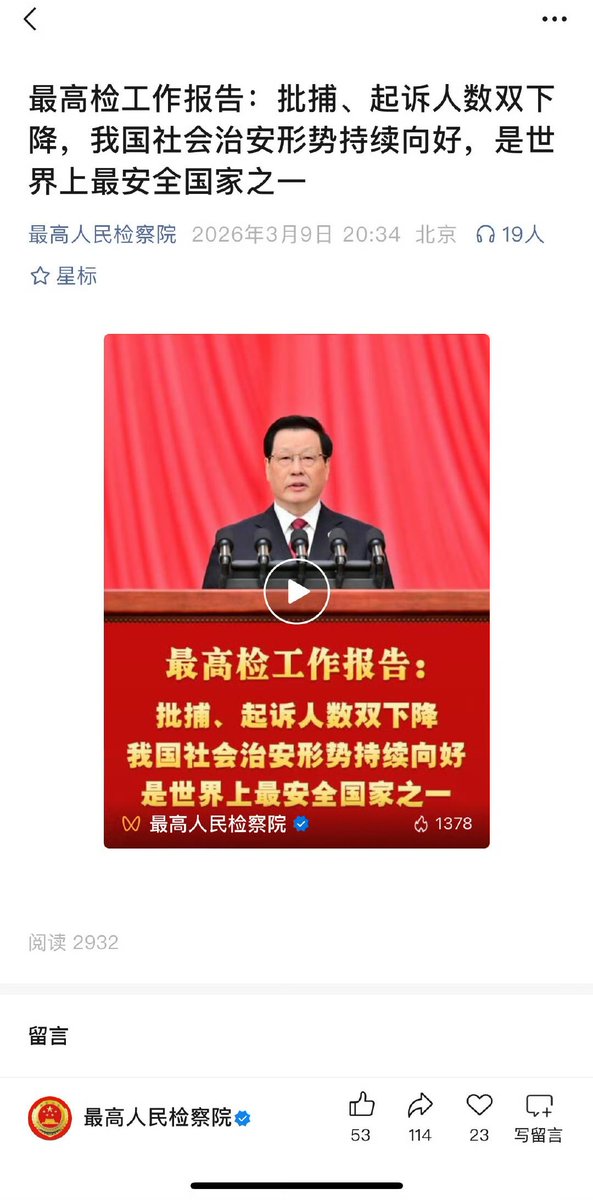 3月9日,最高检工作报告:批捕、起诉人数双下降,我国社会治安形势持续向好,是世界上最安全国家之一