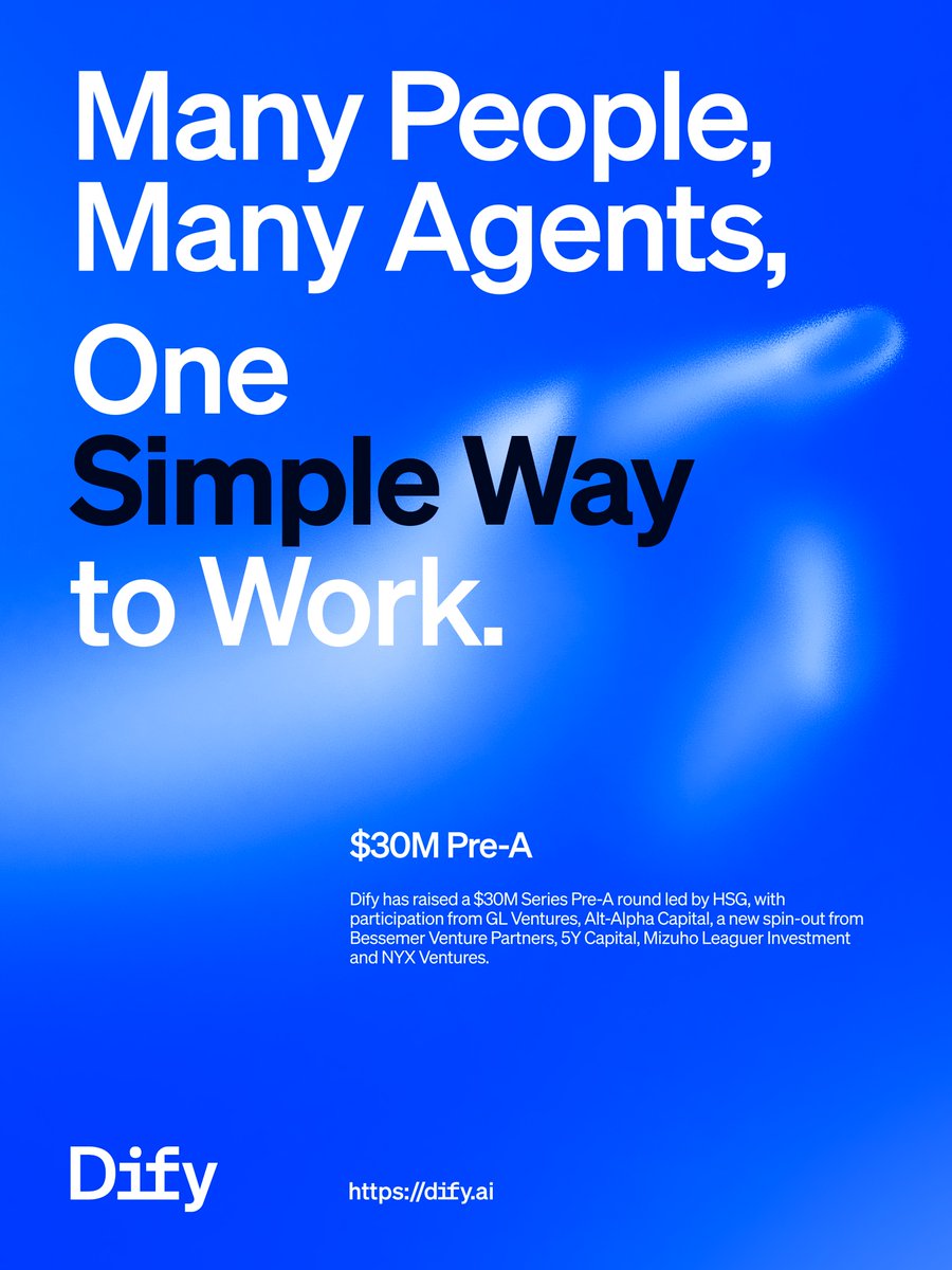 开源 AI 应用开发平台 Dify 完成 3000 万美元 Pre-A 轮融资,由红杉资本(HSG)领投,GL Ventures、Alt-Alpha Capital(Bessemer Venture Partners 旗下新分拆基金)、五源资本、瑞穗利合投资和 NYX Ventures 跟投。其中五源资本是老股东追加投资。