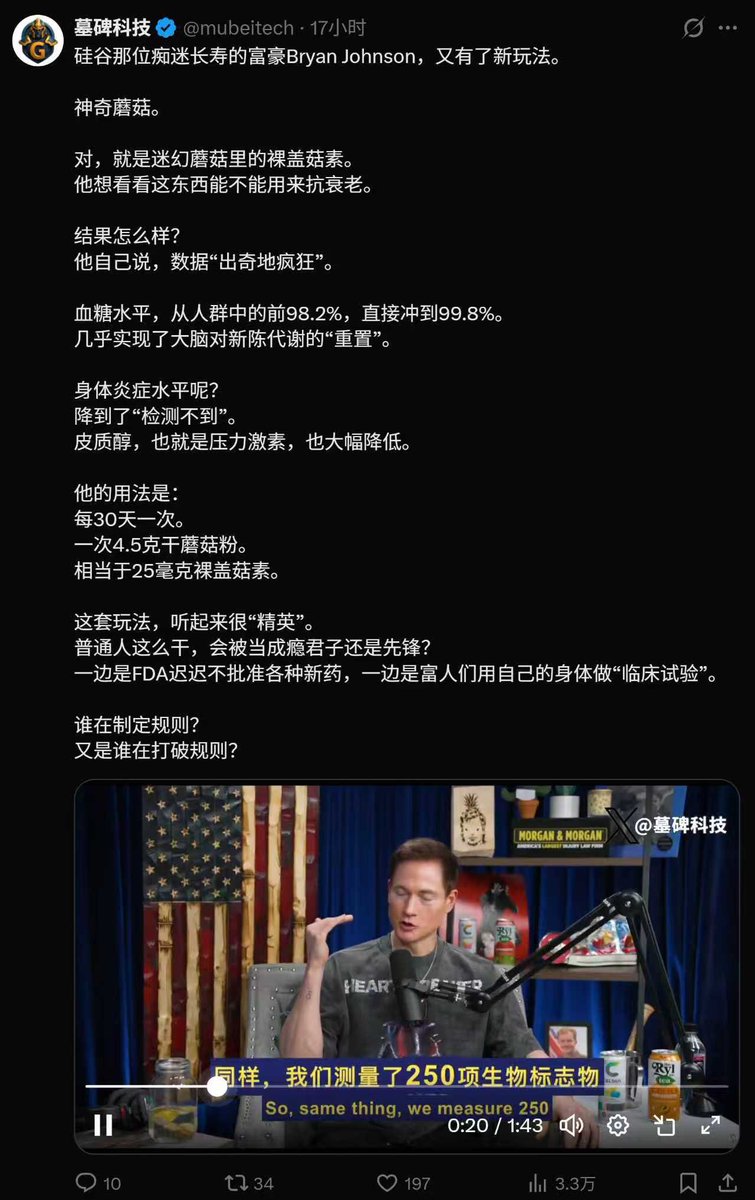 说实话,Bryan Johnson很多方法我都做了,包括他的补剂我也有买,家里现在吃的橄榄油就是他的,现在他蘑菇都弄起来了,这玩意我有点不敢试啊,再说了这玩意哪里去弄?