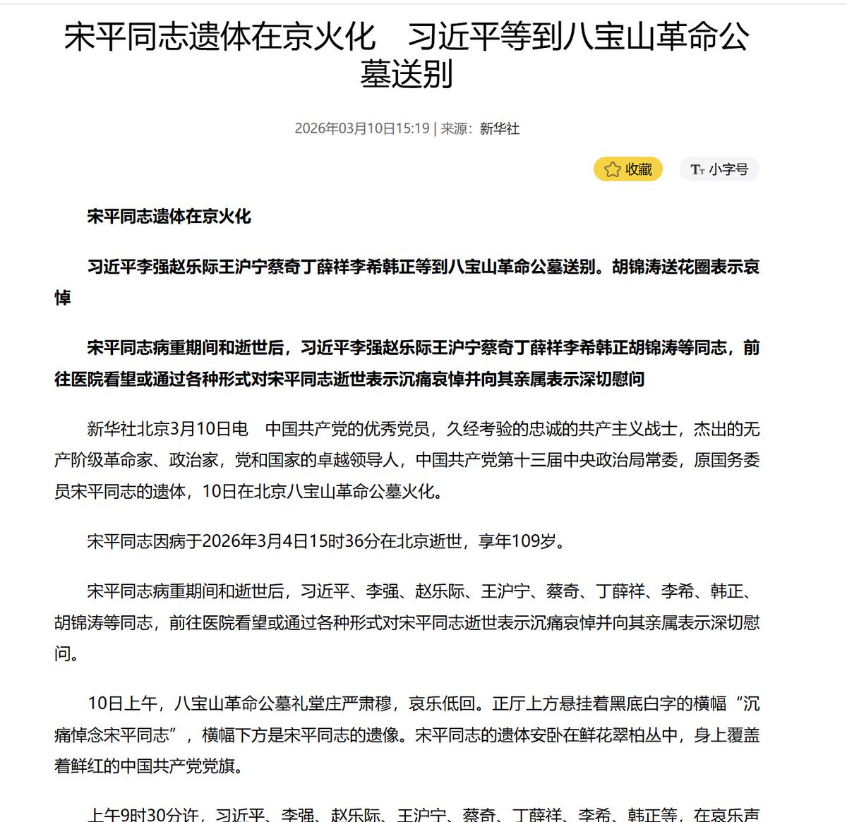 3月10日,习近平、李强、赵乐际、王沪宁、蔡奇、丁薛祥、李希、韩正 等来到八宝山革命公墓,向宋平作最后送别。胡锦涛送花圈,对宋平逝世表示哀悼。