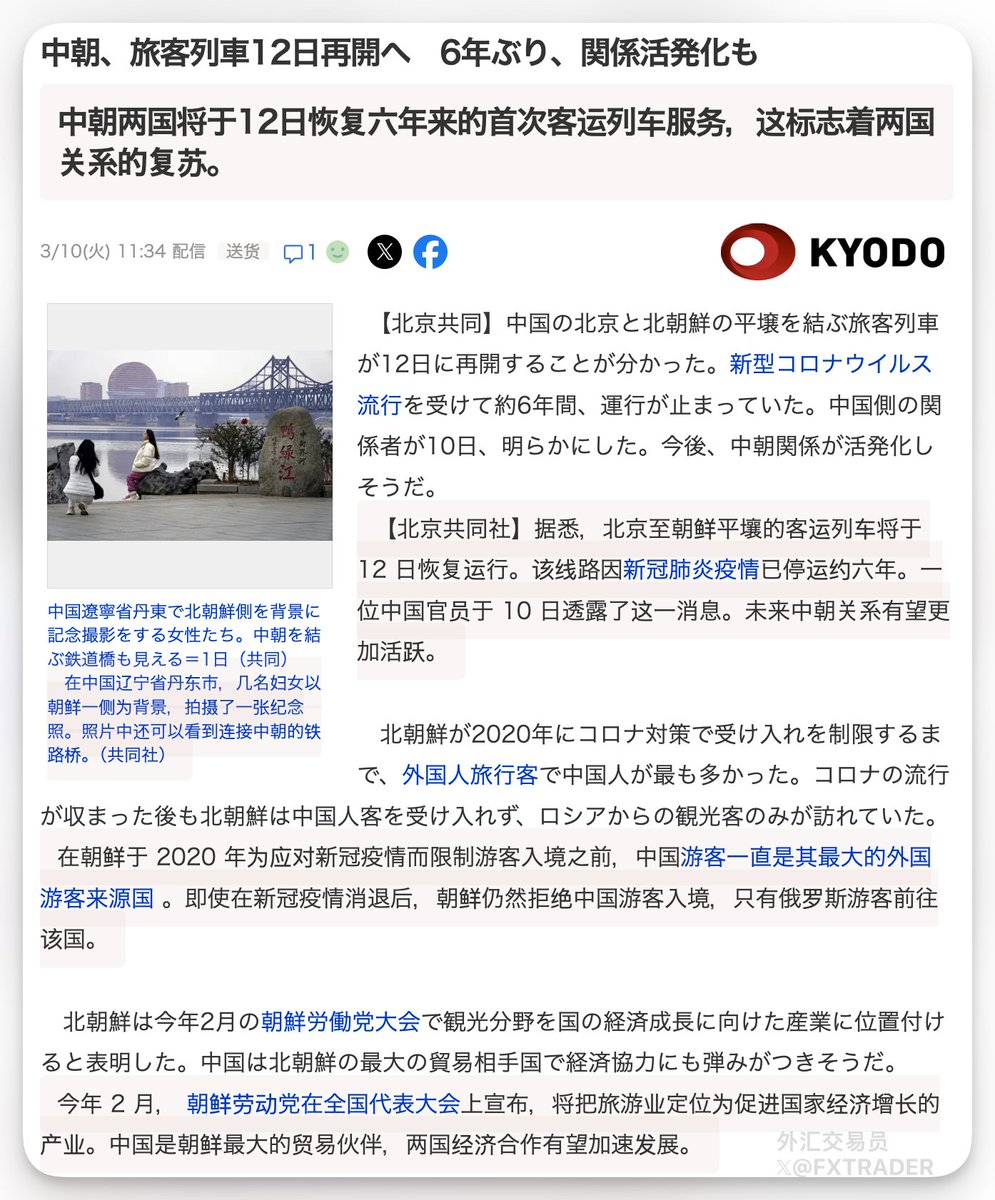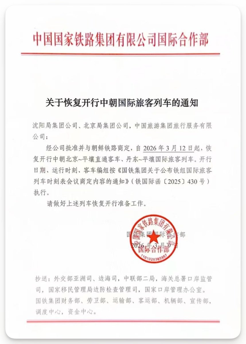 消息:自疫情起停运6年后,中朝国际旅客列车将自3月12日起将恢复运行。