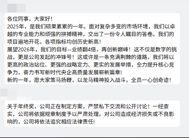 我的情况,整个2025年,公司项目多的根本做不完。公司要求997,没加班费,我都默默接受。但是克扣年终奖,实在太过分。底层正式员工每月的工资很低,也就能维持温饱。现在不发年终奖,感觉天塌了希望通过曝光,能给公司领导压力。