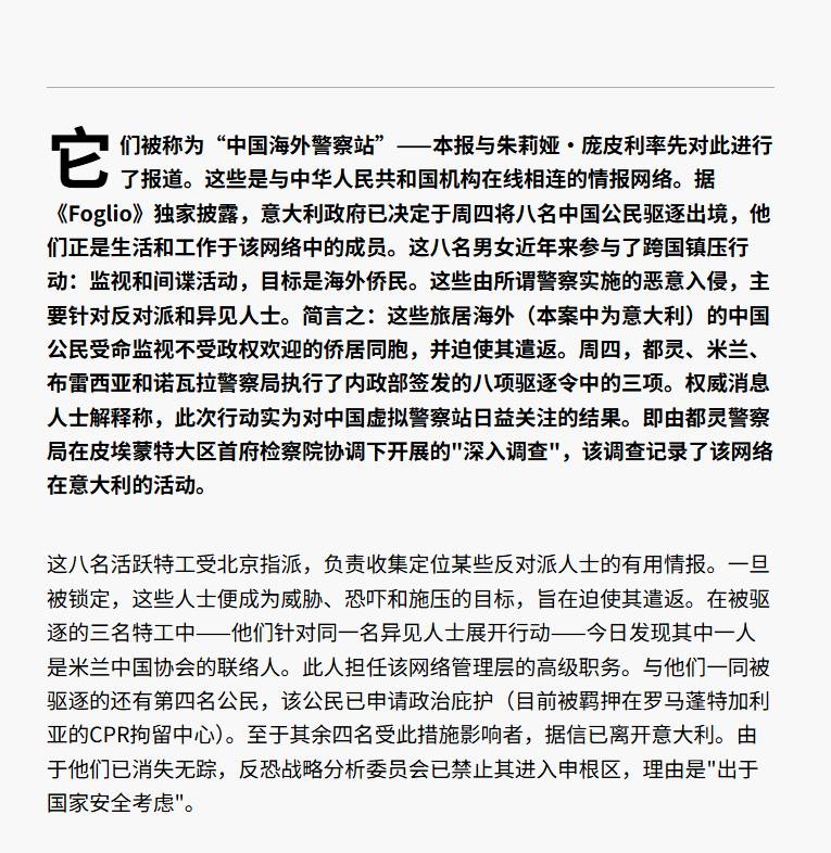 意大利媒体foglio,报道了意大利政府对8名中国间谍的驱逐事件