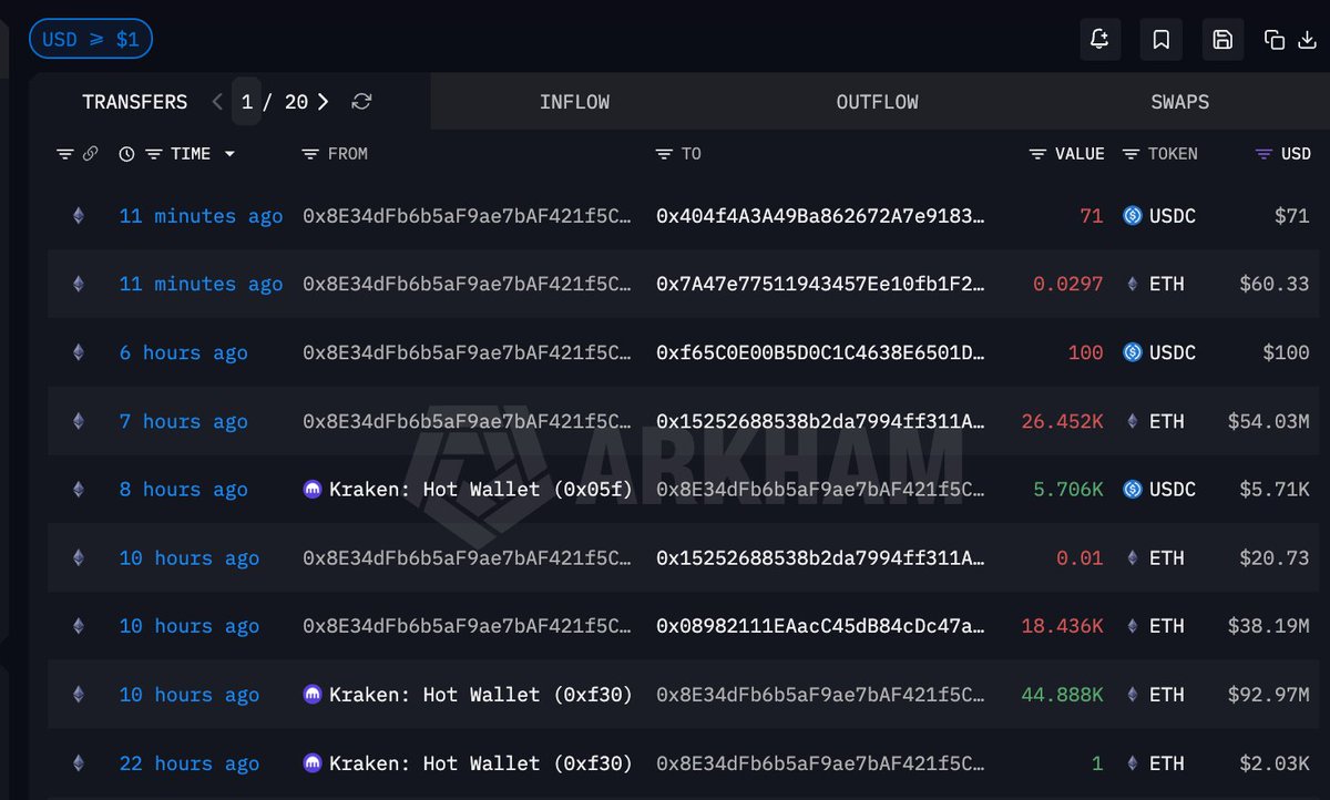10 小时前从 #Kraken 提出 44888 ETH,价值 9297 万美元,提出价格 $2071.1,现已转移至 2 个地址