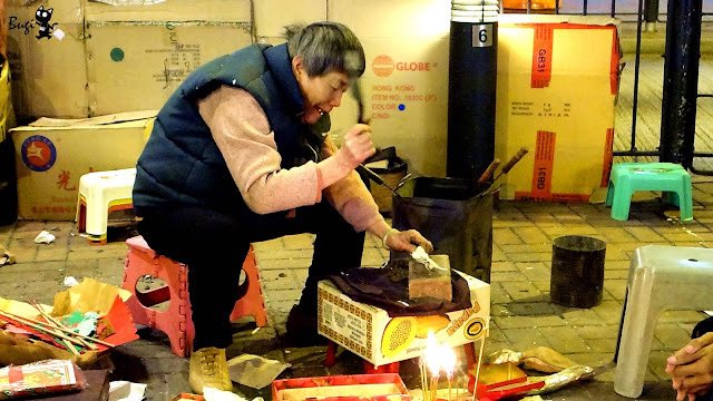 In the most famous public location, under the Canal Road Flyover in Hong Kong, the ritual is commonly performed by elderly women who specialize in it.