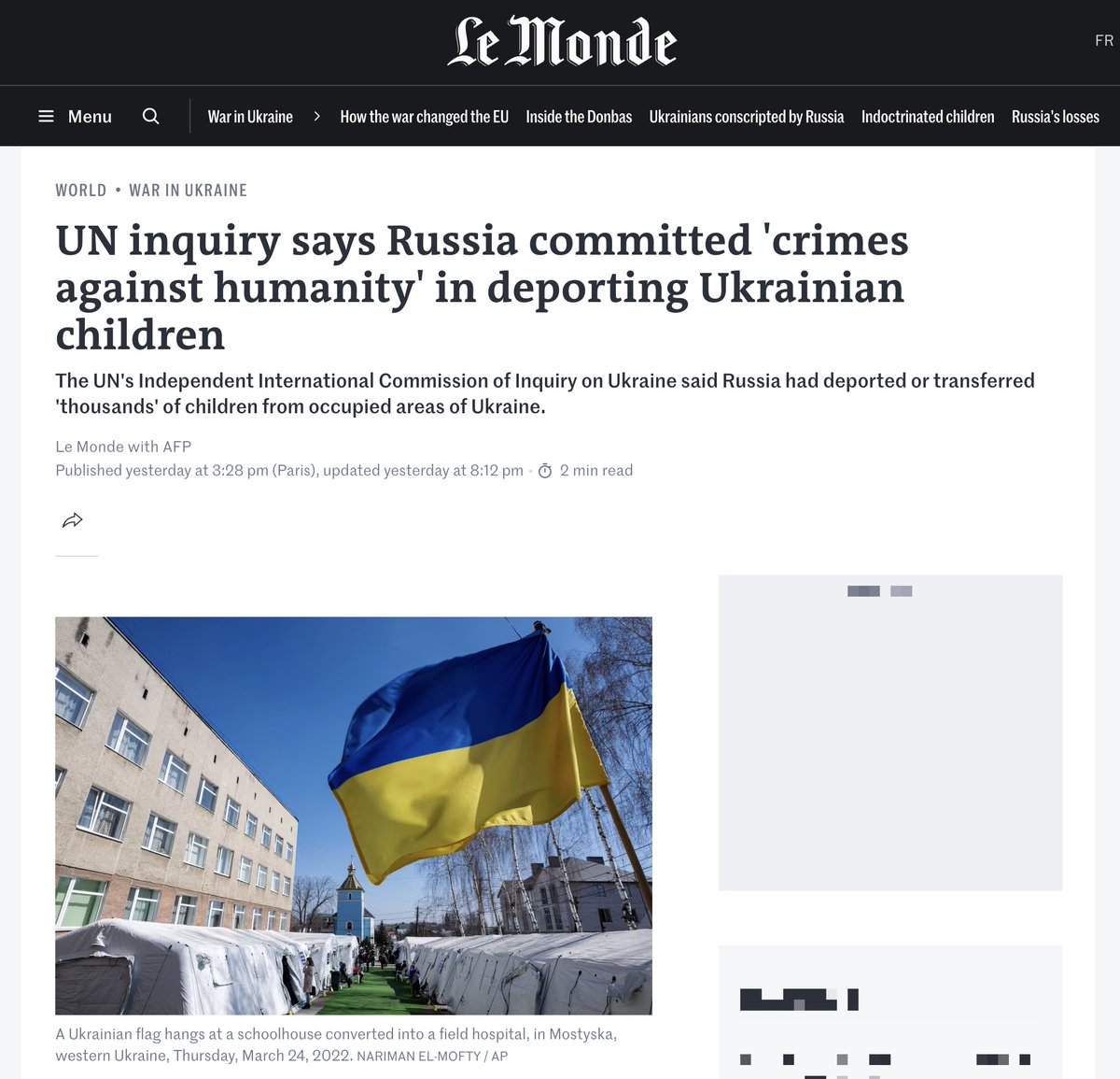 3月10日,多家外媒报道,联合国委员会已正式认定俄罗斯驱逐乌克兰儿童的行为构成危害人类罪。