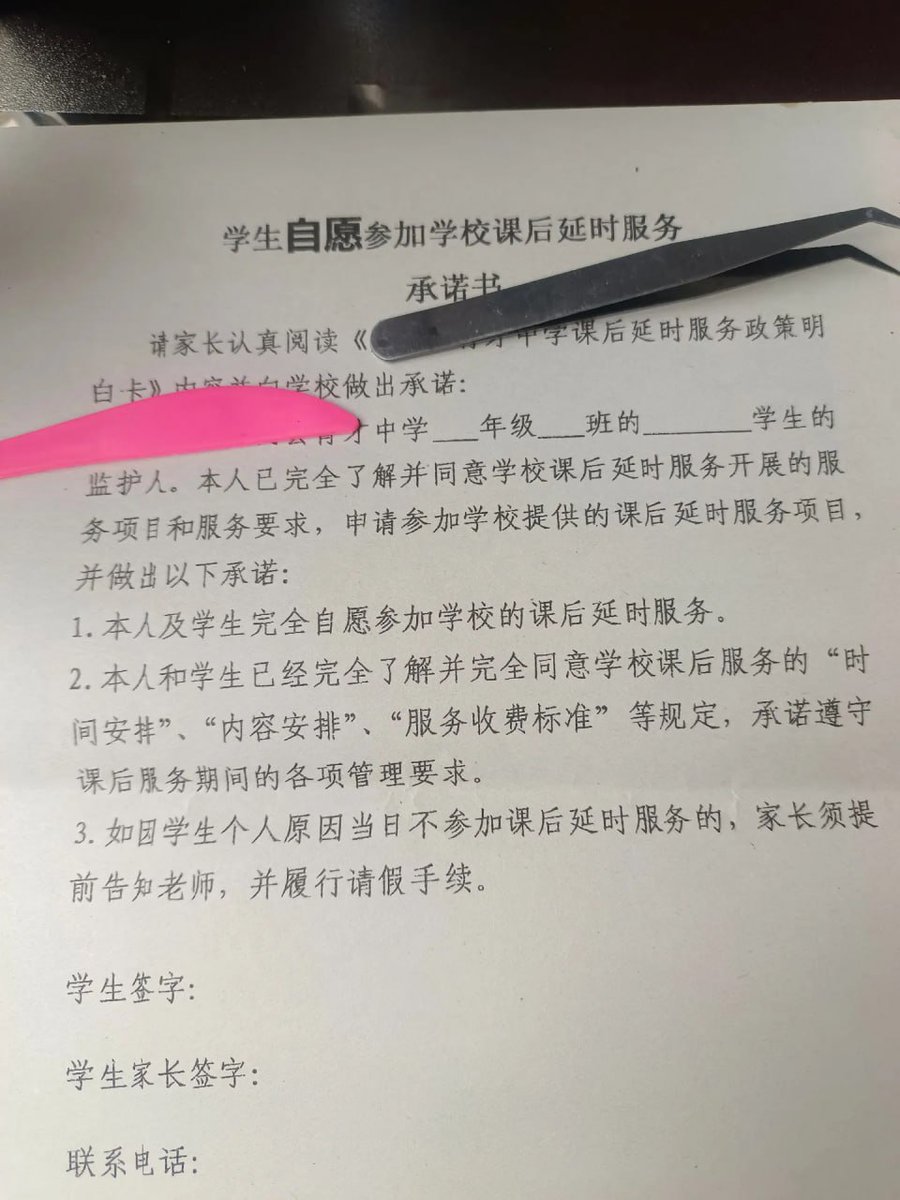3月10日,河南。一名家长晒出开学时学校让孩子带回家、要求家长签字的《学生“自愿”参加学校课后延时服务承诺书》。家长表示,为了突出“自愿”,校方还在承诺书标题上特意将这两个字加大加粗。