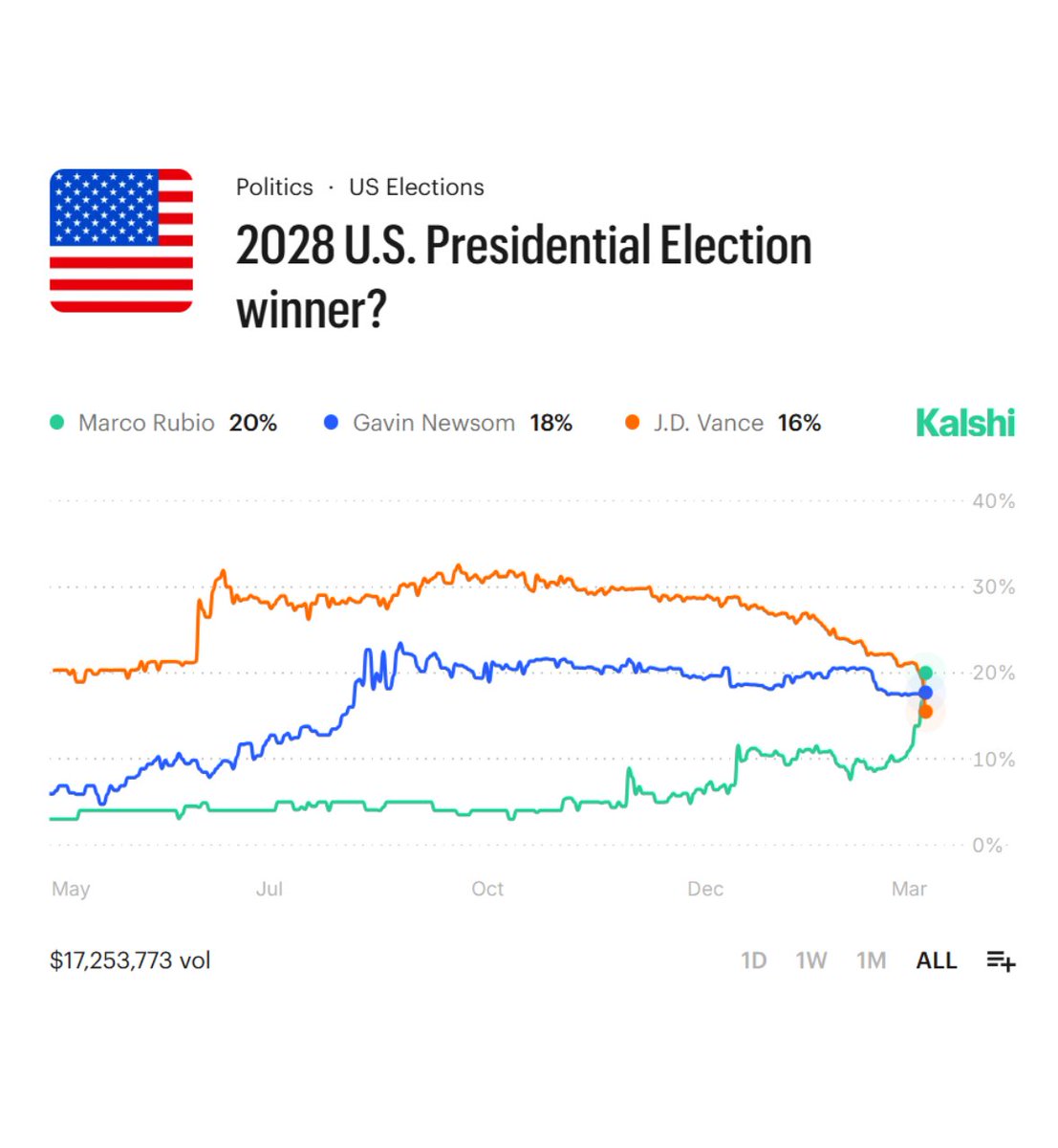 Marco Rubio is now the favorite to win the US Presidency in 2028, overtaking Gavin Newsom and JD Vance, at 20% according to prediction market