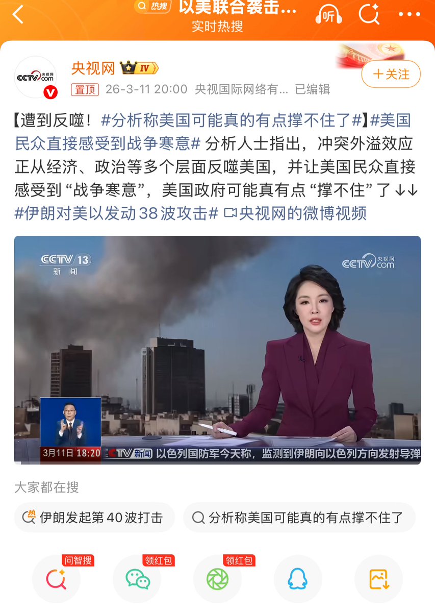 3月11日,央视报道称:分析人士指出,冲突外溢效应正从经济、政治等多个层面反噬美国,并让美国民众直接感受到“战争寒意”,美国政府可能真有点“撑不住”了