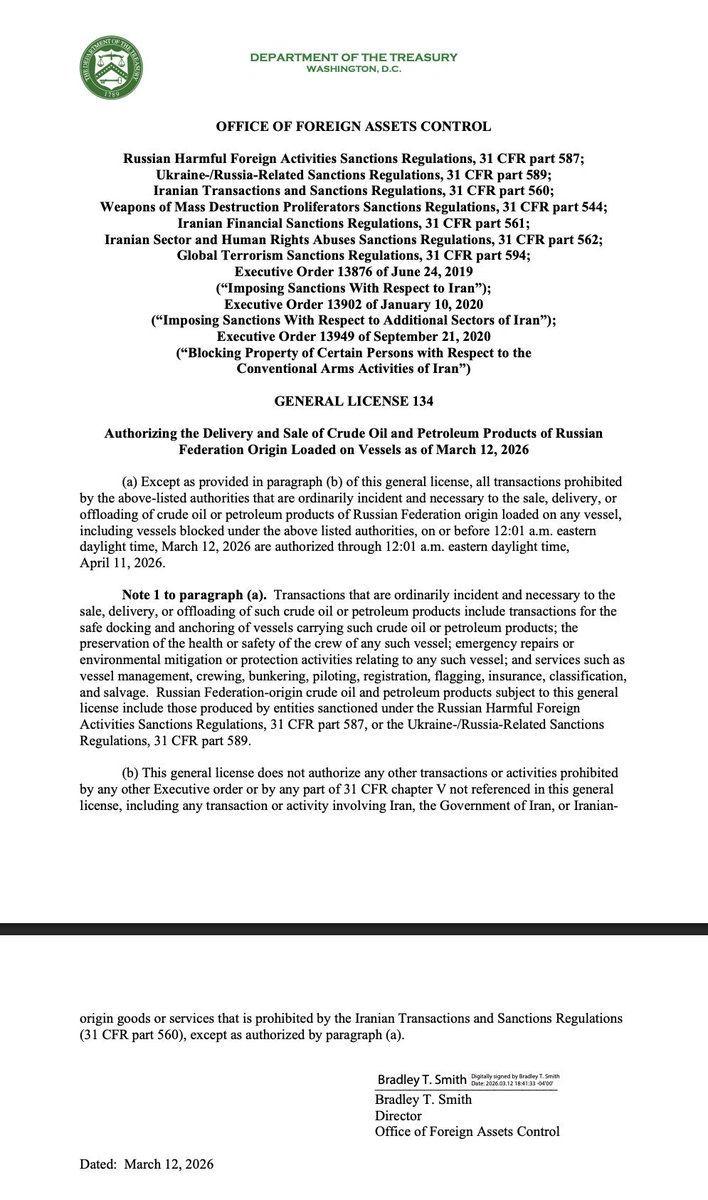 美国财政部下属的 Office of Foreign Assets Control(OFAC)发布了一项新的与俄罗斯相关的通用许可,授权销售和交付截至2026年3月12日已装载在船只上的俄罗斯联邦原产原油及石油产品。