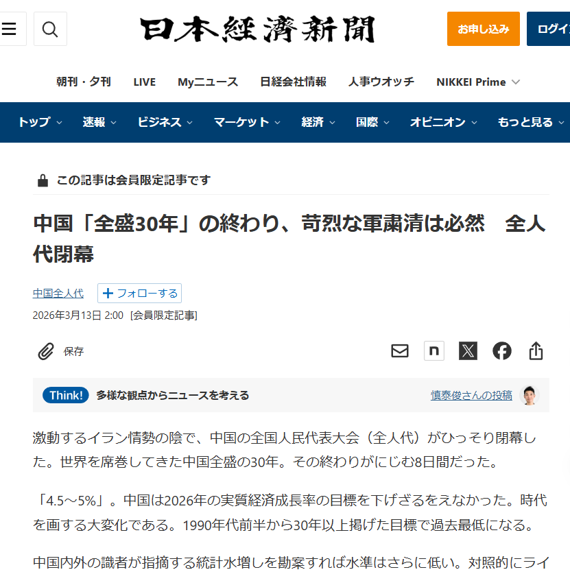 看完最新中國兩會秀場的日本經濟新聞作者寫道,中國全盛30年終結,嚴酷的軍隊整肅實屬必然。