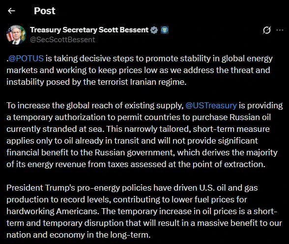 美国财政部发布30天豁免令,允许各国购买目前滞留海上的俄罗斯石油,旨在稳定因伊朗战争及霍尔木兹海峡航运受阻而动荡的全球能源市场。