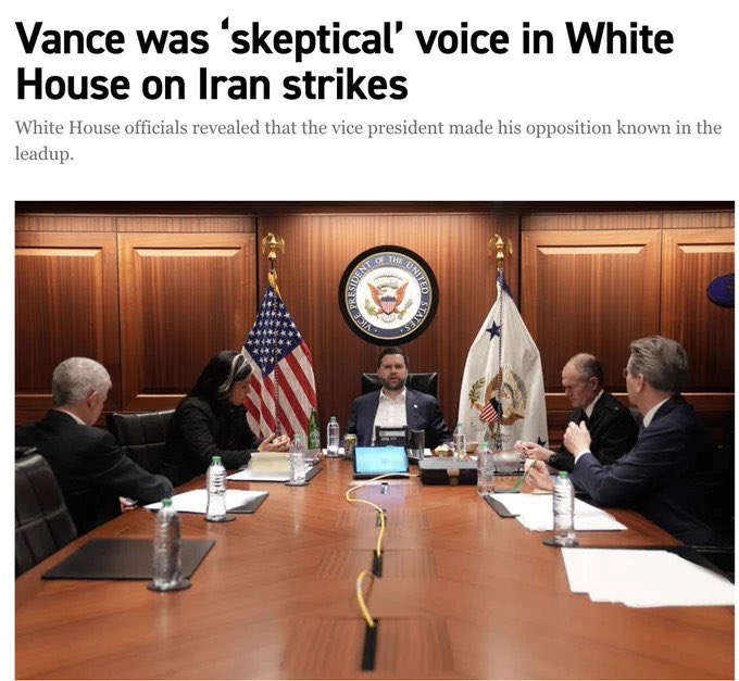 据《政治》杂志报道,美国副总统万斯在川普下令对伊朗发动打击之前,曾私下表示反对。知情官员形容他"持怀疑态度"、"担忧行动能否成功",并称他"根本就反对这场战争"。官员表示,万斯的职责是提供不同观点,但"一旦决策拍板,他会全力支持"。川普本人也承认两人存在分歧