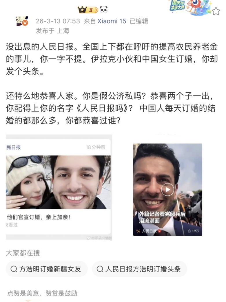 3月13日,“伊拉克记者方浩明结婚”的消息上了《人民日报》头条。 一名博主怒批:没出息的人民日报。 全国上下都在呼吁的提高农民养老金的事儿,你一字不提。 伊拉克小伙和中国女生订婚,你却发个头条。 还特么地恭喜人家。你是假公济私吗? 恭喜两个子一出,你配得上你的名字《人民日报吗》? 中国人每天订婚的结婚的都那么多,你都恭喜过谁?