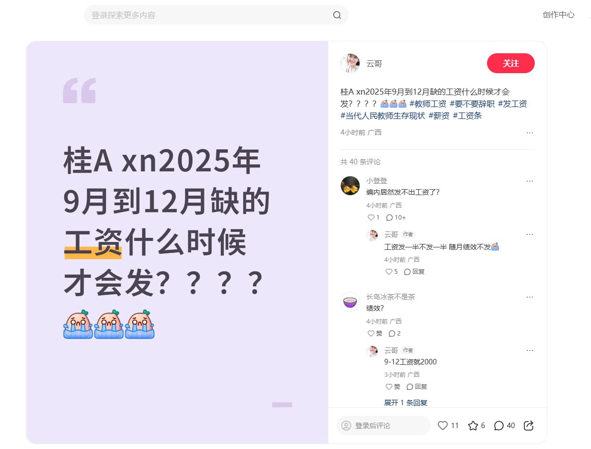 3月12日,广西省南宁市兴宁区,一名教师发帖反映:2025年9月到12月缺的工资什么时候才会发,她表示工资发一半不发一半,岁月绩效不发,且9至12月的工资就2000元。
