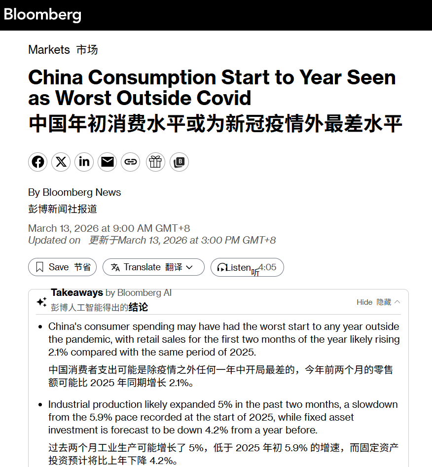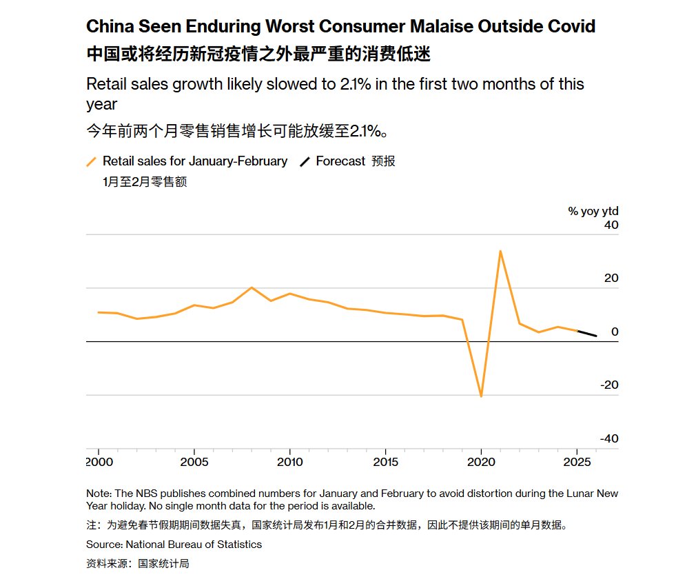 彭博社: 中国1-2月的消费水平或将创下新冠疫后的最低最低水平 3月13日,根据彭博社对经济学家的调查中值预测,在官方数据于3月16日公布之前,中国今年前两个月的社会消费品零售总额预计同比增长2.1%。 如果这一预测成真,这将是自2000年该统计数据开始发布以来的最低水平,仅高于2020年1月至2月因新冠疫情冲击导致经济骤降的时期。