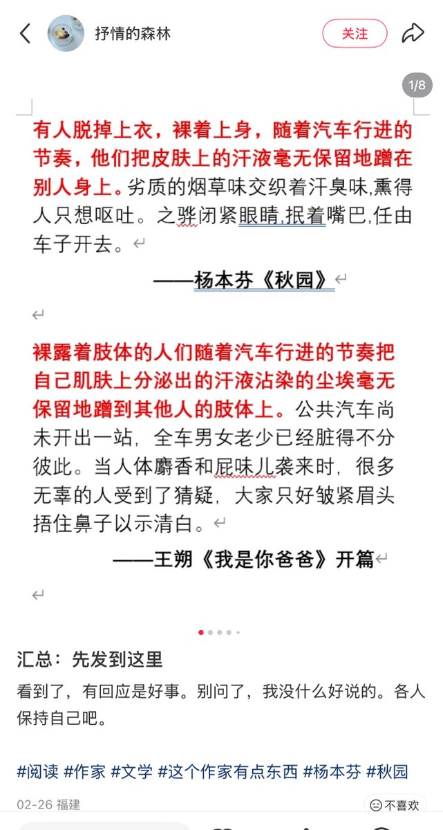 《凤凰周刊》引述“抒情的森林”称,有作家曾私下联系他,“言语粗鄙,试图‘解决’问题”,更有甚者在被指抄袭后以命相搏,在个人账号上留下遗书,让“抒情的森林”被部分网民指责是“杀人凶手”,一度遭到网暴。