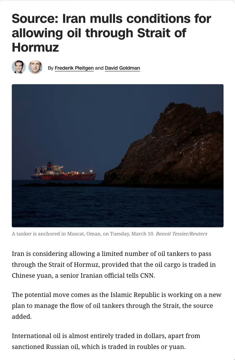 3月14日,据CNN援引一名伊朗高级官员消息称,伊朗正在考虑允许有限数量的油轮通过霍尔木兹海峡,但前提是这些石油货物必须以人民币进行交易。
