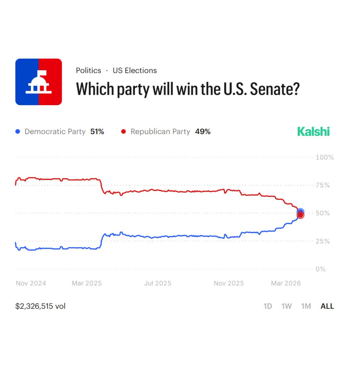 The Democratic Party is now at 51% and has overtaken the Republican Party as favorite to win the US Senate, according to prediction market .
