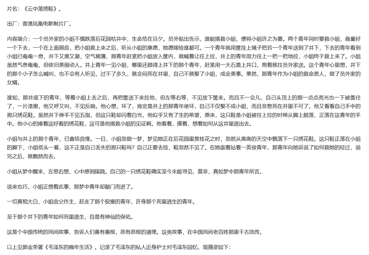 毛泽东的黑心1975年8月的一天,晚饭后,毛泽东、张玉凤、孟锦云、李玲师在一起看电影。片名:《云中落绣鞋》。出厂:香港凤凰电影制片厂。看完这部片子,主席问了小张、小孟、小李这样一个看起来很可笑的问题。 “你们说说看,这两个救小姐青年,哪个好些?”主席漫不经心地问道。 “当然是在井