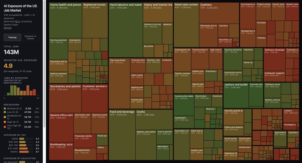 Andrej Karpathy整的新活儿,不出意外应该是他用前几天刚刚弄好的AutoResearch做的。 他扫描了全美342个行业的143万个职位,用可视化的方式呈现了它们被AI取代的可能性(1-10),绿色的代表不容易被替代,红色代表容易被替代。目前整体平均值是4.9, 意味着一半左右的职位都是危。 网址在这里:https://t.co/kYWnl10fNf