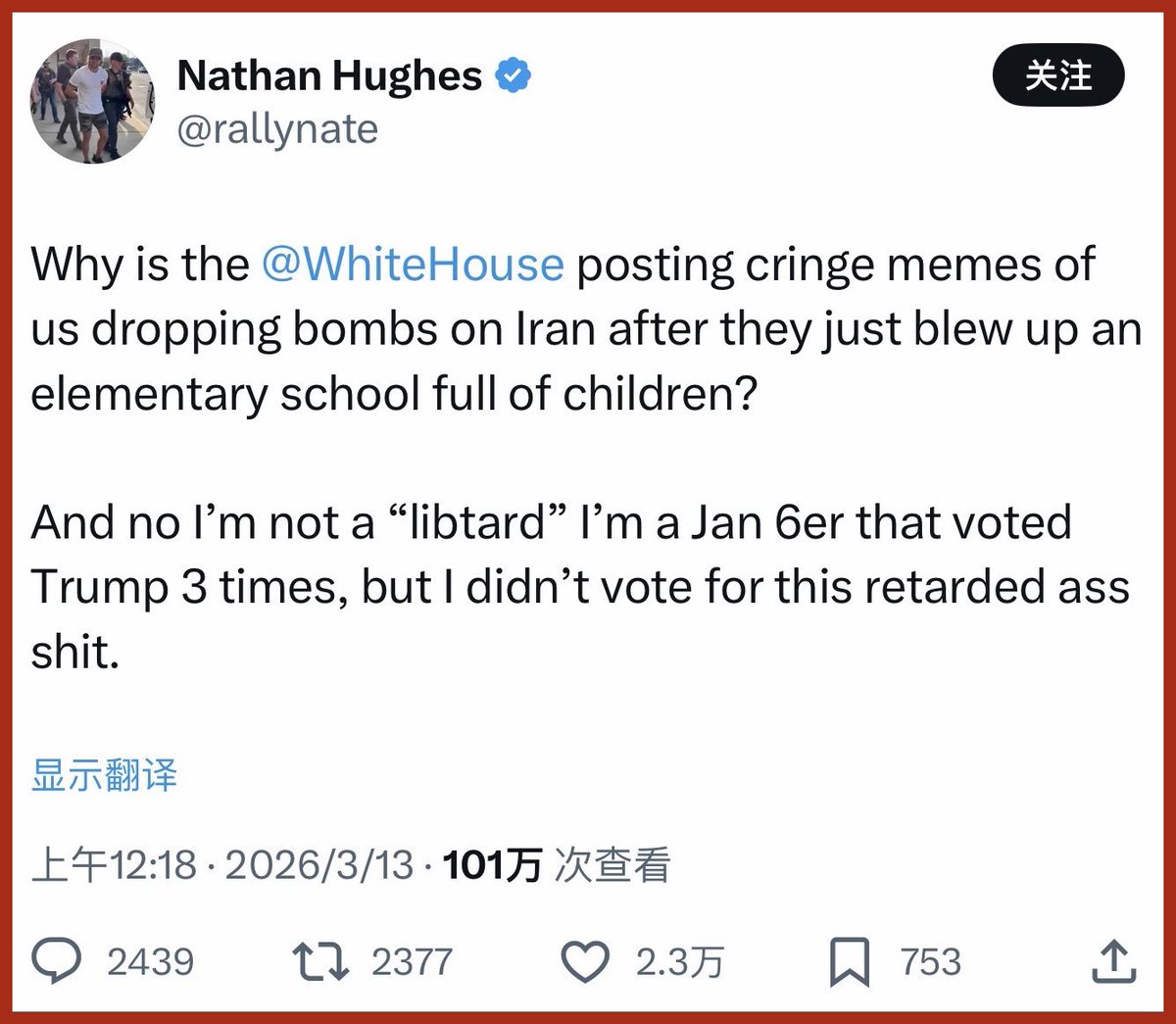 现在就连冲了国会山,三次投票给川普的绝对铁杆白MAGA,都在批评川普了。 这位说: “为什么他们刚把一所满是孩子的小学炸毁之后,白宫还在在网上发这种“我们轰炸伊朗”的尴尬梗图? 我可不是什么左B,我是参加过1月6日的人,我给川普投了三次票。 但我可没投票支持这种脑残的破事。” 所以说: 有些红脖子洋川粉只是傻,起码还有点良知。但华川粉既蠢且坏,比最没文化的红脖子还不如,真的可悲。