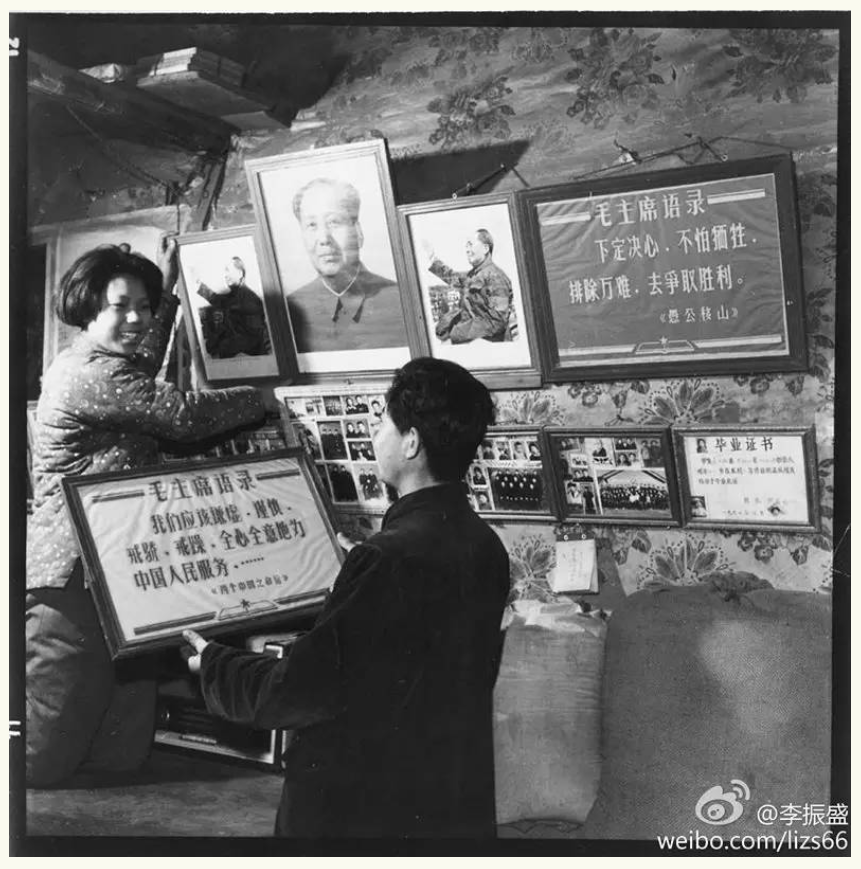 “1966年12月我拍的农村小俩口用毛像布置新房照片,村里年轻人逗弄小伙: 你们夜里就在毛主席眼皮底下干那事? 小伙答: 一关灯毛主席啥也看不见了!