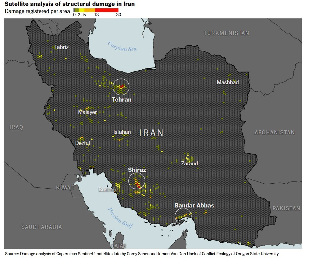 卫星图统计伊朗军事设施遭到打击的情况,德黑兰第一(首都),设拉子第二(核研究相关),阿巴斯港第三(霍尔木兹)。其实就两栖登陆来说,前期的火力压制准备已经做的差不多了。