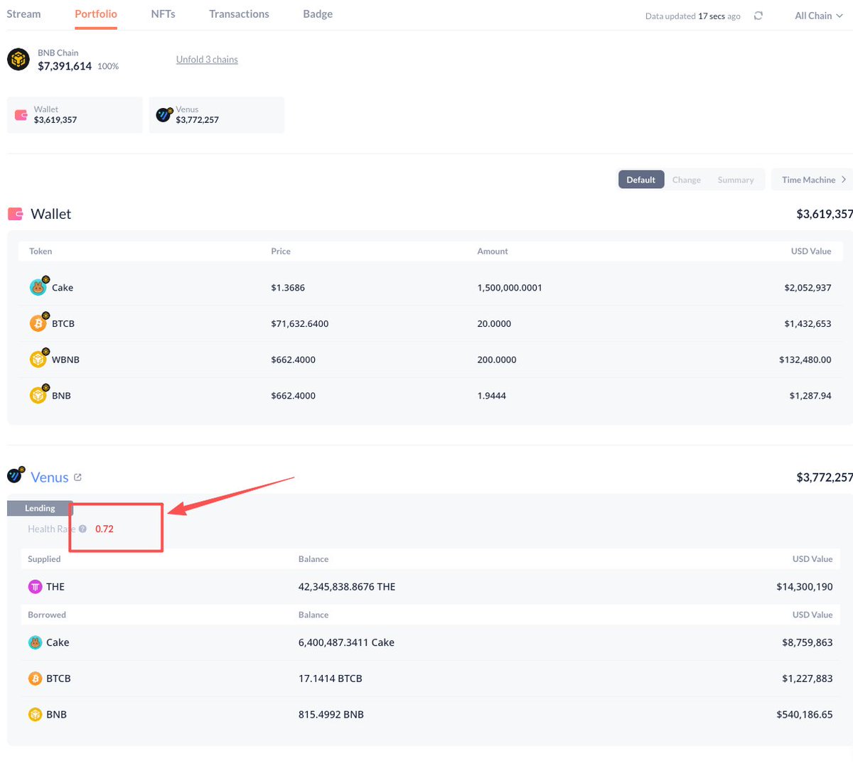他搞到了20个BTC,150万个Cake,200个BNB。