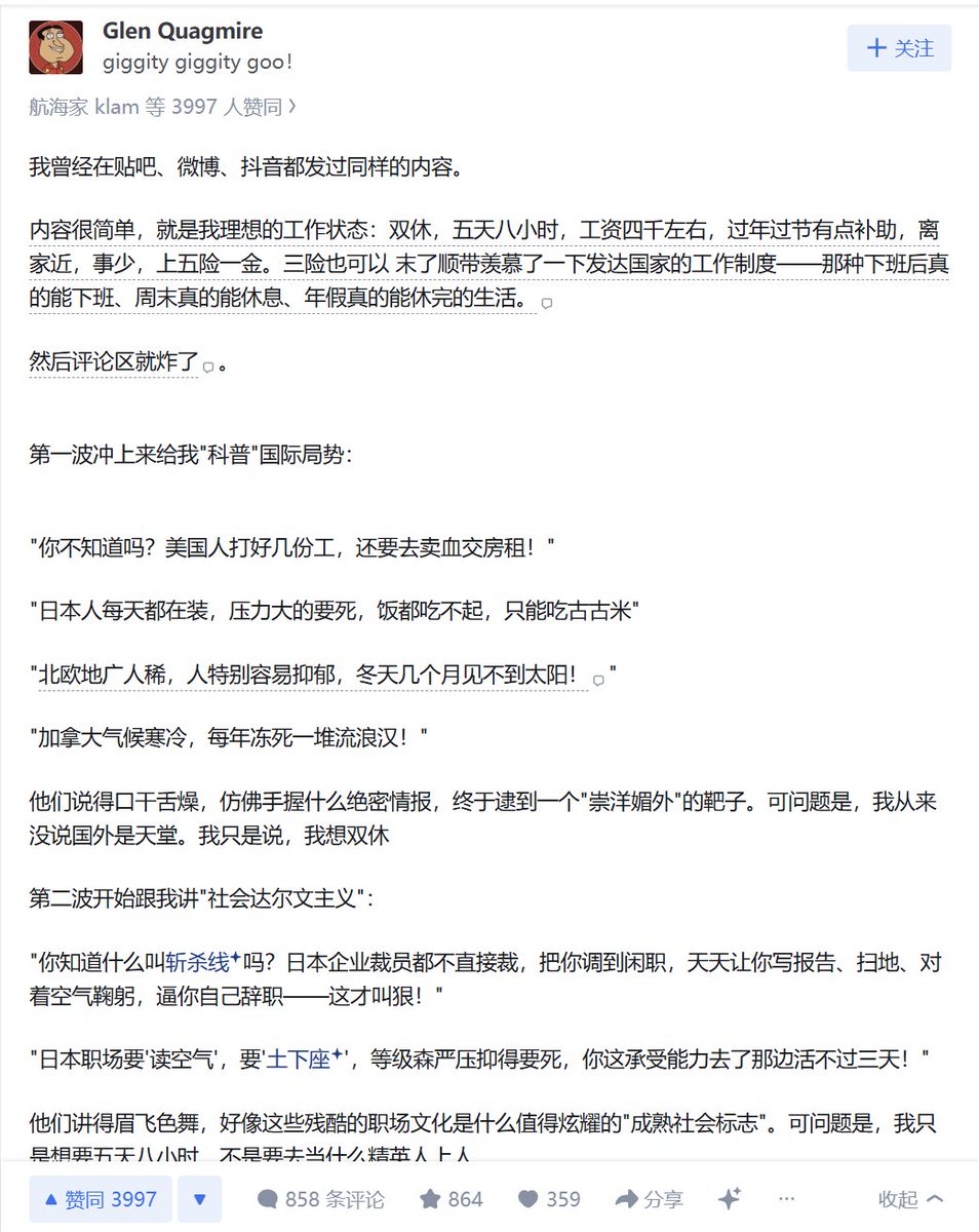 3月14日,一名知乎网友称,他曾经在贴吧、微博、抖音,呼吁双休五天八小时工作制,顺便又科普了一下国外发达国家的工作制度。