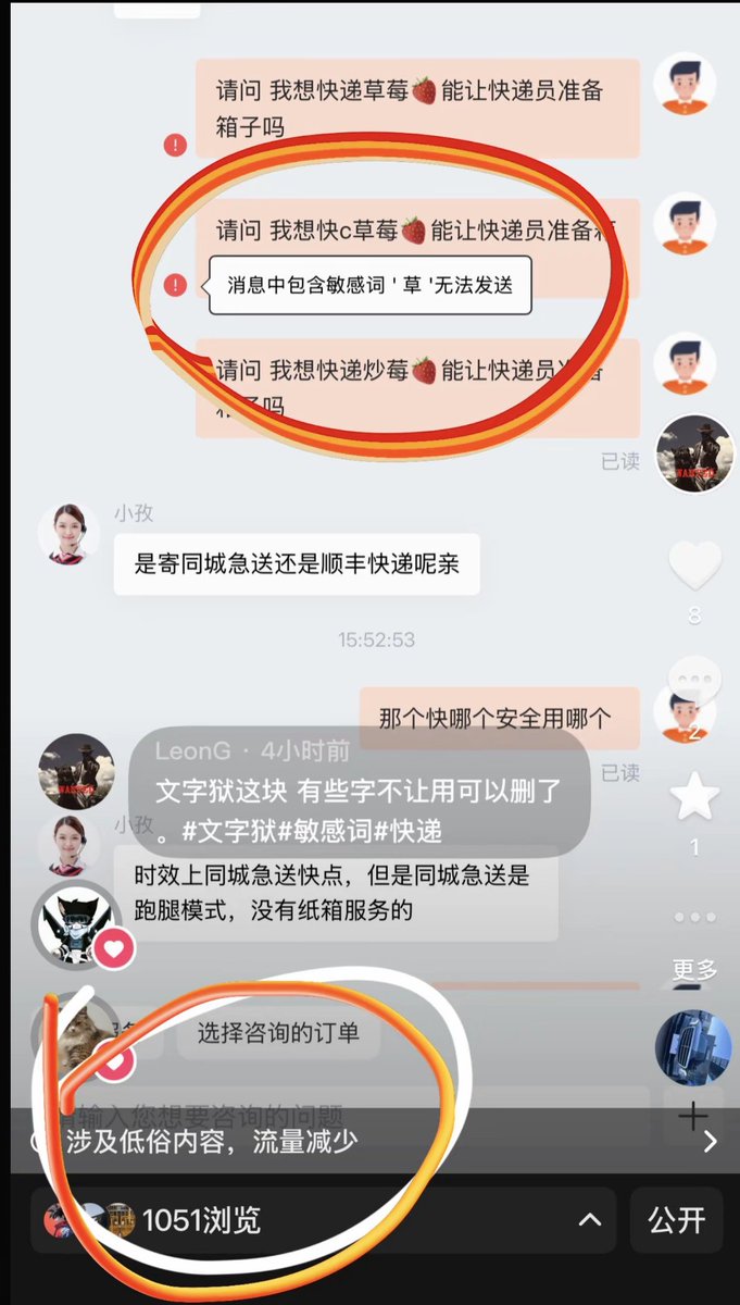 3月11日,四川。一名网友在微信顺丰小程序咨询客服能否邮寄草莓时发现,“草”字被系统判定为违禁词,消息无法发送。