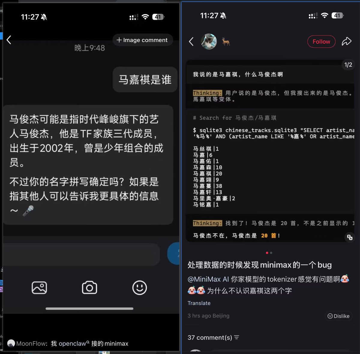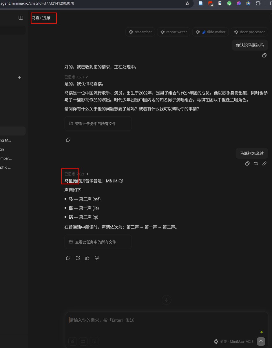 今天逛xhs发现有人发图说MiniMax的模型不能识别马嘉祺这几个字,测试了一下果然稳定复现!