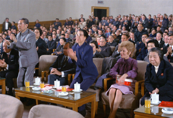 (图:在观看革命取得胜利的场景时,周恩来和江青起身鼓掌致意。)