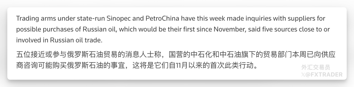 路透:美国给与豁免后,中石化与中石油等中国国有大型油企重新采购俄罗斯原油。