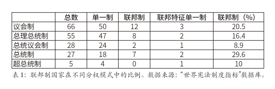 还有人主张,总统制更适合联邦制,因为联邦更需要统一,而总统是国家统一的象征。但这也是想当然,议会联邦制国家实际上并不少。联邦制国家中,议会制和总统制几乎平分秋色。根据我们对176个国家的最新统计,如果把具有联邦特征的单一制国家权重除以2再和联邦制国家数量相加,那么表1显示,议会制中的联邦制比例达到20.8%,仅比总统制比例29.6%略低,高于半总统制国家,并显著高于总统议会制和总统制中的超总统制国家的联邦制比例。