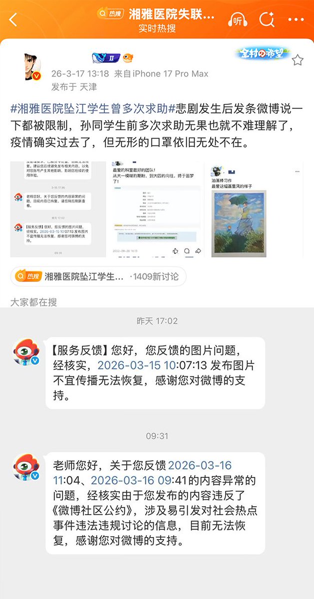 另一名博主说:湘雅二院悲剧发声后,我发条微博为其发声都被限制,孙同学生前多次求助无果也就不难理解了,疫情确实过去了,但无形的口罩依旧无处不在。