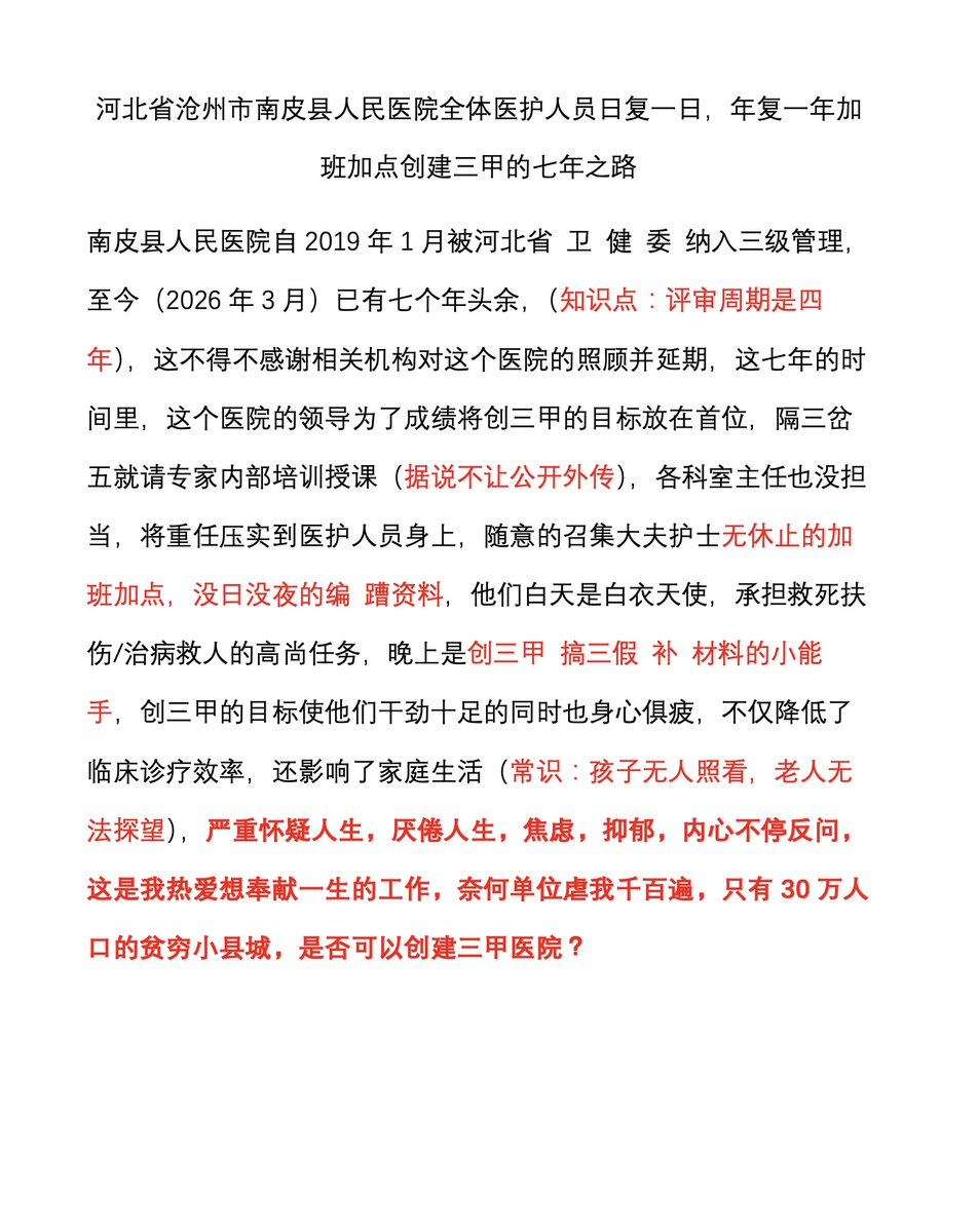创三甲的目标使他们干劲十足的同时也身心俱疲,不仅降低了临床诊疗效率,还影响了家庭生活(常识:孩子无人照看,老人无法探望),严重怀疑人生,厌倦人生,焦虑,抑郁,内心不停反问,这是我热爱想奉献一生的工作,奈何单位虐我千百遍,只有30万人口的贫穷小县城,是否可以创建三甲医院?